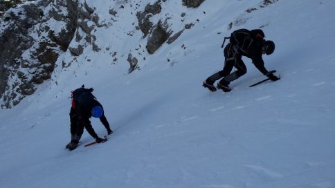Zimski su visokogorci zategnuli svoje gojzerice, dereze i kacige, nabrusili cepine, te se sigurno i školski otisnuli put Male Mojstrovke u Julijskim Alpama. Prekrasan dan i čvrst snježni pokrov bili su prava podloga za vježbanje novih planinarsko-penjačkih vještina na 1. izletu tečaja.